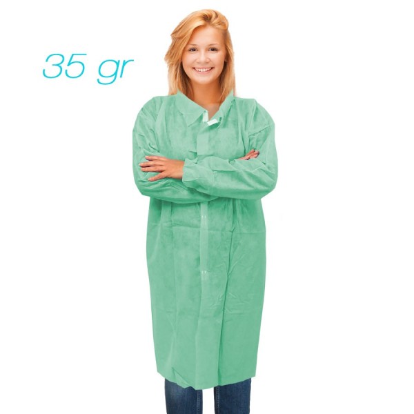 Estas batas de 35 gr con cierre de velcro y fabricadas en TNT de polipropileno son de las más demandadas, pero la variedad disponible es mucho mayor, desde batas con corchetes hasta batas infantiles, con cintas de 25 gr o para visitantes, entre muchas otras opciones.