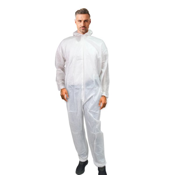 Mono con capucha en TNT de polipropileno plastificado en color blanco con cierre de cremallera